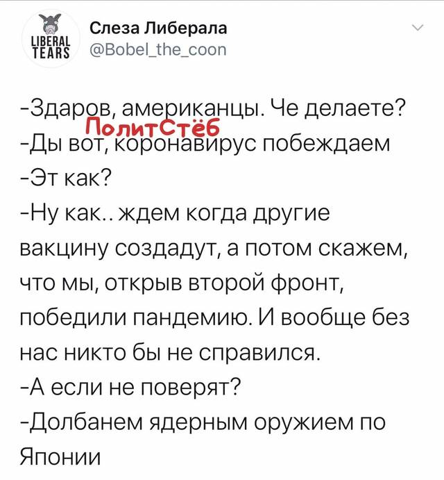Хозяева подпинывают пятую колонну, а те верных боевых хомяков чтобы спровоцировать больше заражений. Им надо, как в Нью-Йорке. Короче, больше крови, больше. А вот хуй-то там, как бы вы они не старались, правоохранительным органам и руководству города даны вполне четкие указания и никто не поведется, иначе пиздюли прилетят незамедлительно. Это в мирное время можно на них рукой махать, а в такое как сейчас слишком выебистых будут ставить на место.