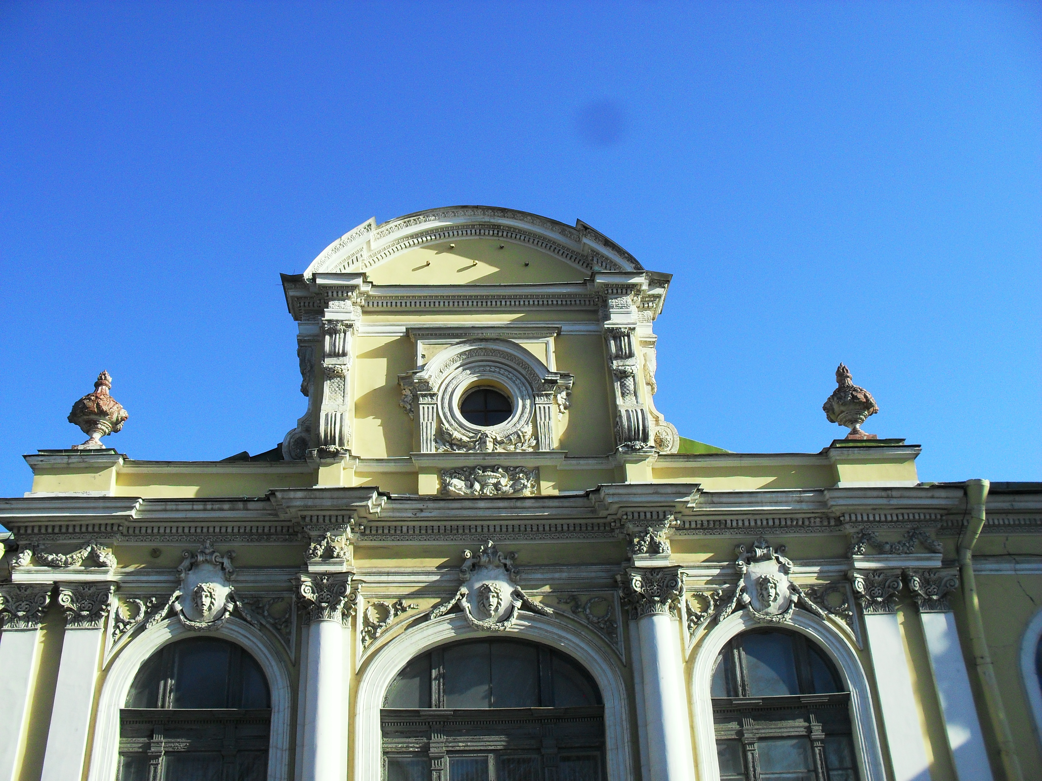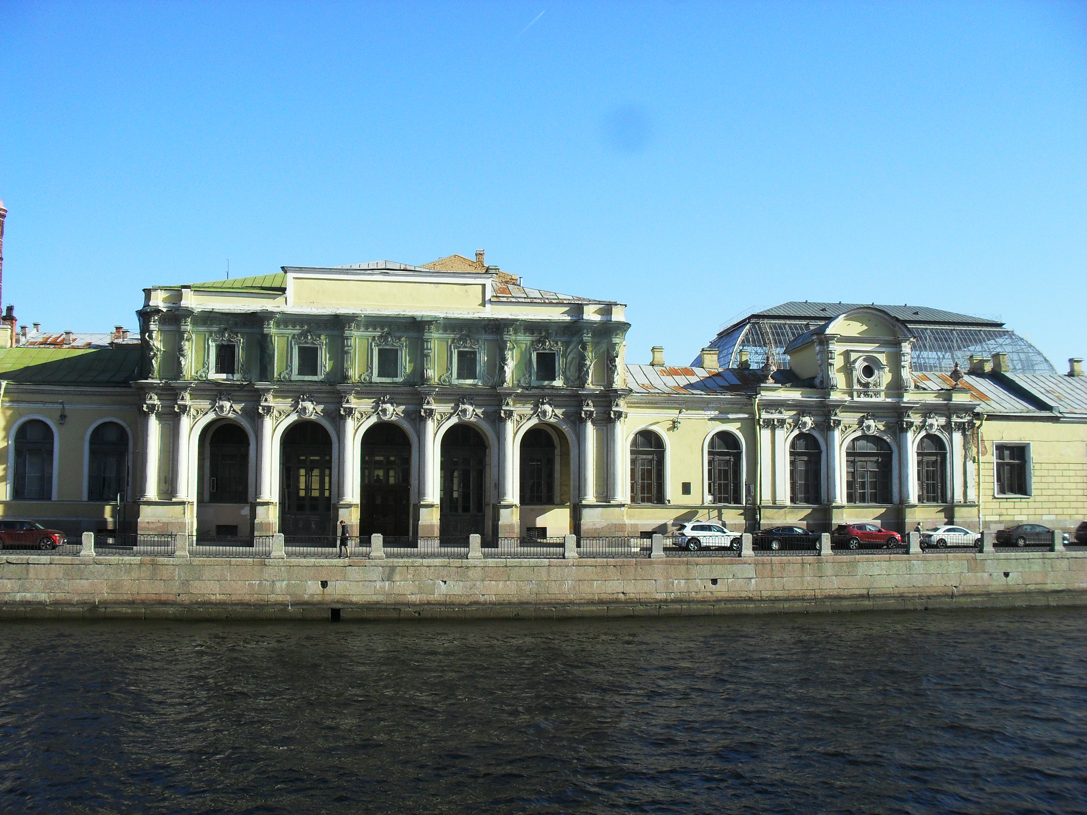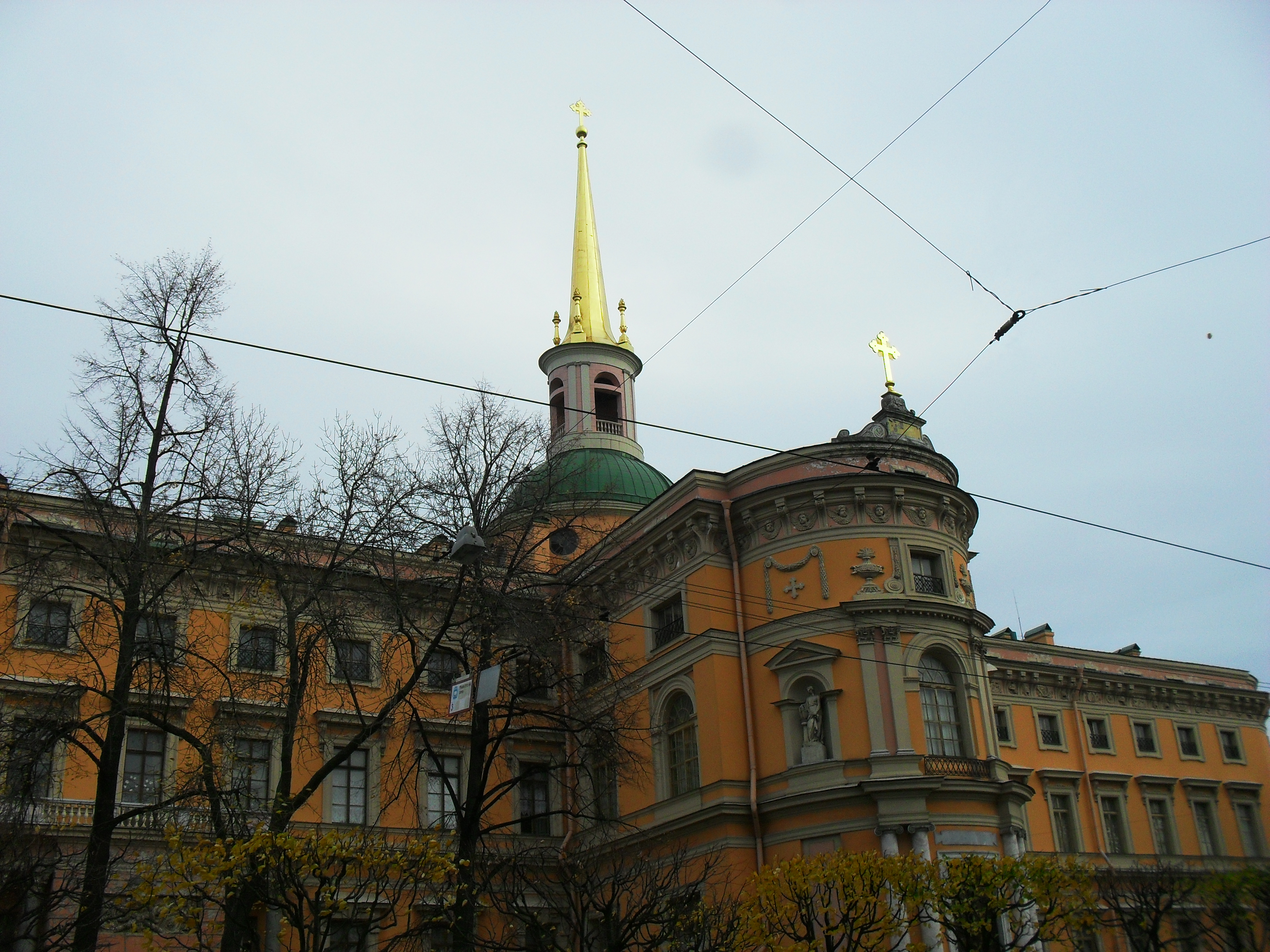 Начинаю прогулку, выйдя из офиса. Это особняк 18-го века, охраняемый государством. Принадлежит Минобороны. Вон тот, желтый, с флагами. Маленькая улочка с пятью домами - Гангутская. Нечётный дом всего один - это наш особняк. На четной стороне три или четыре дома, точно не помню. Там живут бохатые и вице-мэр.